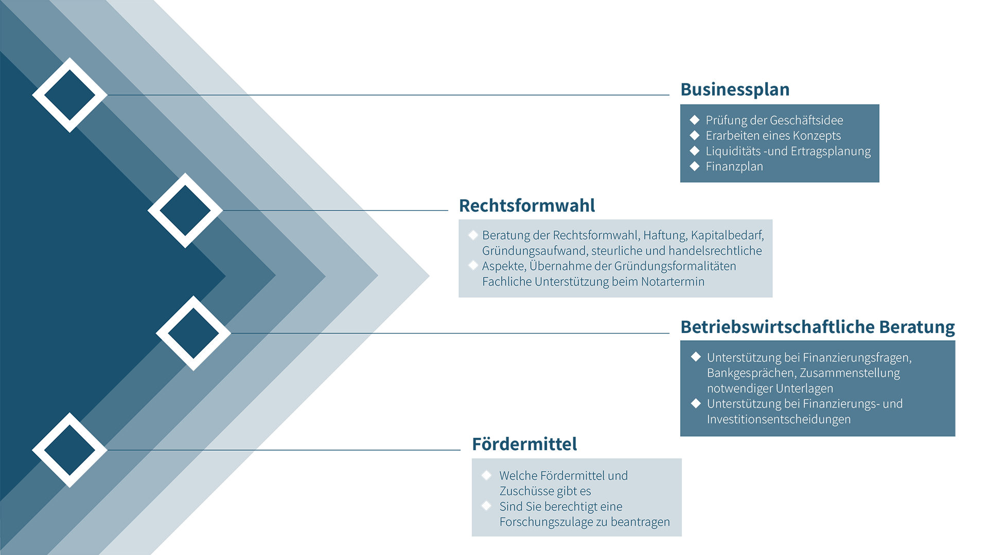 Die Gründung Ihres Unternehmens soll nicht zu einem unkalkulierbaren Abenteuer werden? Wir begleiten Sie auf Ihrem Weg in die Selbstständigkeit. Mit unserer betriebswirtschaftlichen und steuerrechtlichen Beratung und Expertise sind Sie bestmöglich aufgestellt.